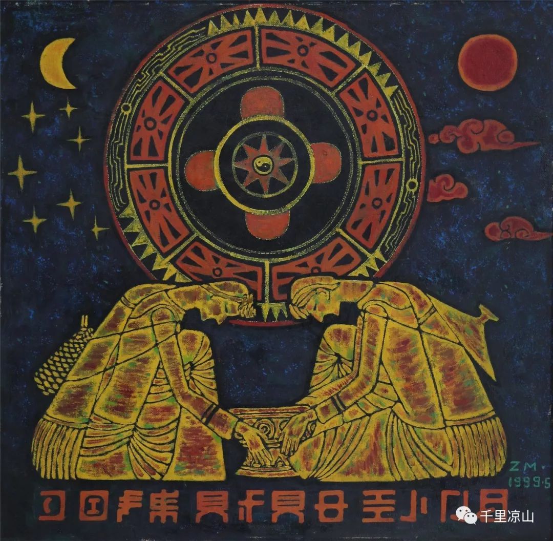他认为历史走到了现代,现实又试图回归历史,回归自然,寻觅本真,但它不是一个圆的简单对接而是一个螺旋式的升华,彝族绘画也如是,“回归也许是一种升华。”