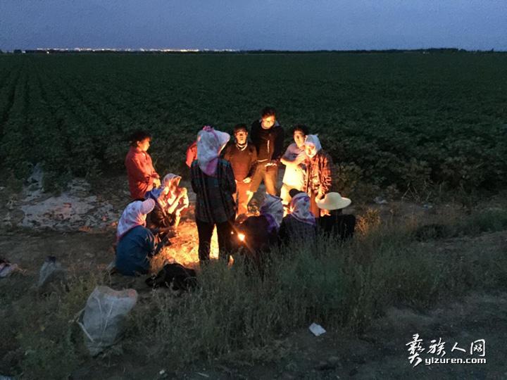 我们跟随这些务工人员来到棉花地时,天还未亮,彝族人自动聚集成一群坐在一起,其他的务工者各自分散等待。坐下后,其中几名妇女拿出刚买的豆花和米饭吃起来,另外几名则是从身上拿出一件旧衣服平放在地上,躺下了。一名妇女给另一名妇女按摩,被按摩的妇女抱怨说昨天太累,腰都直不起来。凌晨五点半的棉花地还有些寒气,彝人开始生起一堆火,其他人迅速围上来。早上过来时,低估了寒城的凌晨,没想到也是寒气逼人,突然间冒出一团火,犹如家中火塘,这片棉花地瞬间温暖起来。