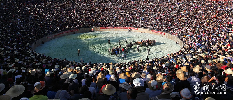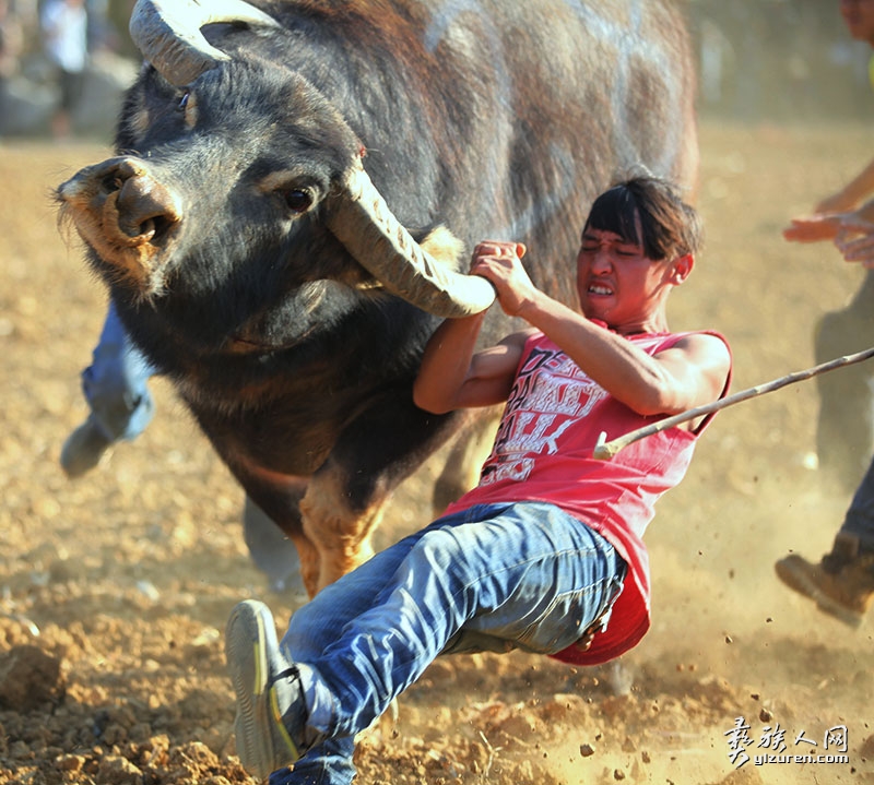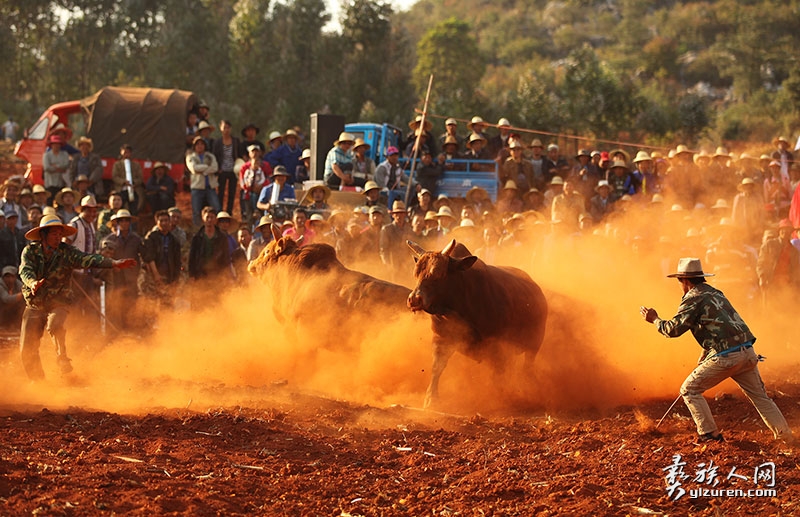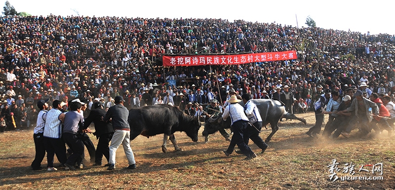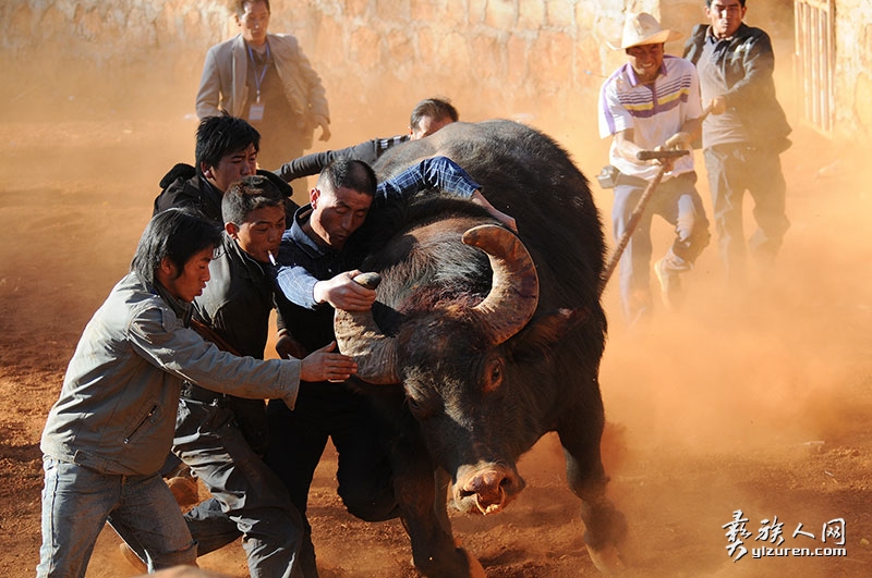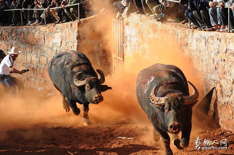 一场精彩的斗牛比赛,少不了勇敢的裁判和组织人员,斗牛和人竞技不同,不仅需要裁判有强壮的体格作为安全保护基础,而且更丰富的斗牛组织管理经验,熟识斗牛的习性,在斗牛出现各种不可预计情况时,才能及时沉着地解决问题。两牛相斗,失败一方常常奔命逃窜,这时裁判必须站出来,用自身之力控制住奔牛,控制住场面。此时,裁判和组织人员的勇敢表现,也成为斗牛场上一道精彩的风景线。Q7V彝族人网(彝人网)- 彝族文化网络博物馆