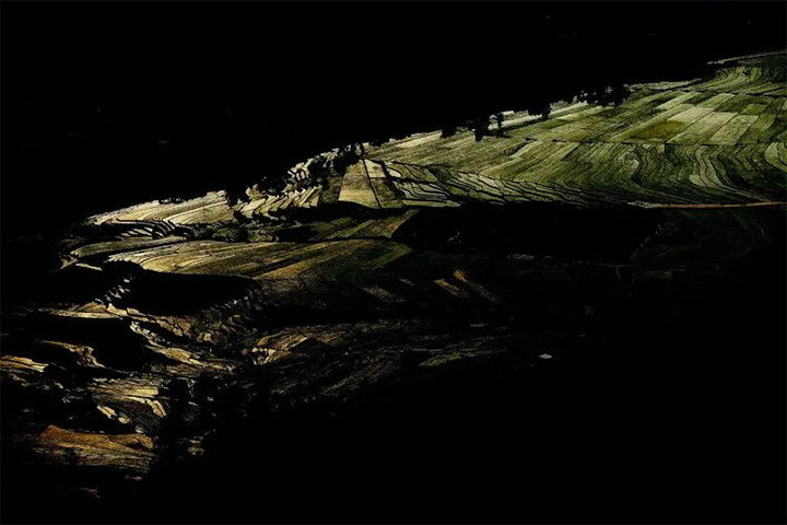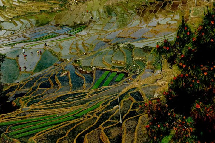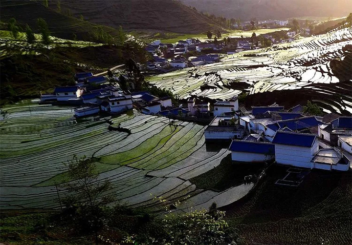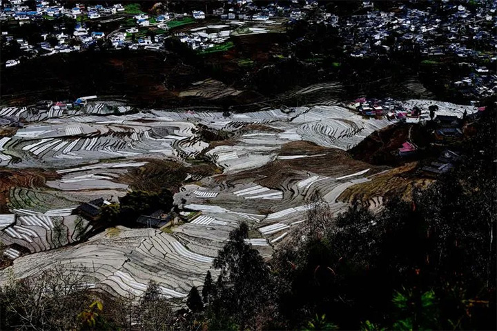 放足了水的梯田映着天色,像极了一块块七色的大玻璃。从高处俯瞰,梯田的颜色极为丰富,像彩色的版画,又似调色盘。蓝色的天空映在梯田的水面上,翠绿的秧苗层次分明,红土、黄土和黑土也各自裸露,色彩斑斓、绚烂美丽。dqS彝族人网(彝人网)- 彝族文化网络博物馆