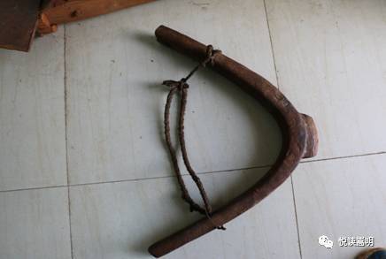 这是牛犋中的木革头,长约尺七八、径约二寸多、中部约一百四十度弧形弯曲的光面硬圆木,两端距沿各约一二寸处顺弯曲方向各有一径约五分的圆透孔,两孔相距约三寸,耕地时,将木革头的内弧架于牛颈上的颈根。