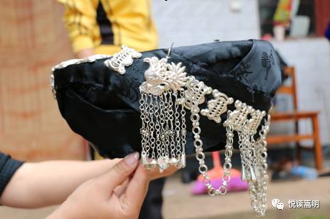 刚坐定,大妈便拿出家中珍藏的宝贝,给我们讲起了它的故事。彝族包头,乌色,村中长者方可佩戴。包头上的配饰,最显眼的要数银制的凤凰了,大小不足10厘米,但能观其全貌,栩栩如生,特别是尾部上竖的九片羽毛,清晰可见,下缀九条银链,末端系银铃、银叶、银穗层次分明;周边并排着八片银色寿形银片,远远望去银光闪闪,好似展翅高飞之状。