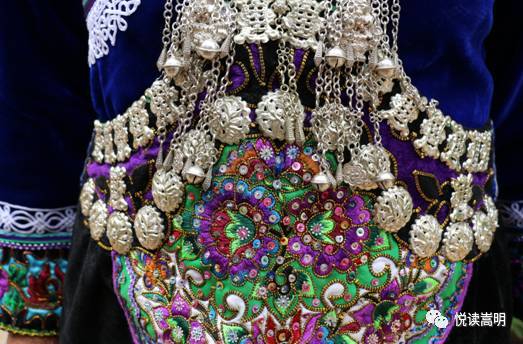 上衣中由刺绣和胸饰组成的围腰,是整套衣服中最显眼、最昂贵的部分,由18块寿型银片,14个叶纹银扣、2个银制蝴蝶及银链构成,在银饰之下,是独具魅力的彝绣,图案纹样以生活中常见的莲花、马缨花为主,疏密有致,对称端庄,满而不繁,均匀平衡,在构图的梳空处点缀以银泡,配上玻璃电光珠和电光片,光彩夺目,极为耀眼。