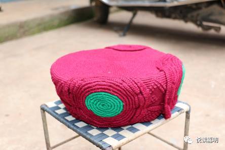 彝族包头的另一形式,红绿相间,四面有四个绿色的圆圈,主要为中年妇女佩戴,由人工缝制而成。
