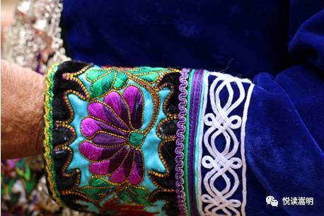 大裤腿的几何纹饰,变化多端,层层铺展。从上往下,第一层为彝族具有民族特色的火焰纹和火把纹,第二层为模仿彝族生活环境的花朵、绿叶纹,第三层为象征幸福、美丽、纯洁意义的四方纹和八角花纹,第四层为代表天人合一意境的花与蝶、人与自然拼合互补的图纹。
