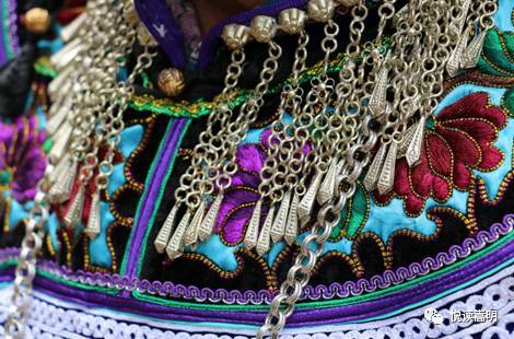 领口的领排花,由纯银手工打制而成,与衣服领相接的银花纽,下由2根八字银链相连,再接一镂空小花,下缀两条银链银穗。载歌载舞时,片片领排花相互碰撞之声,美妙动听。