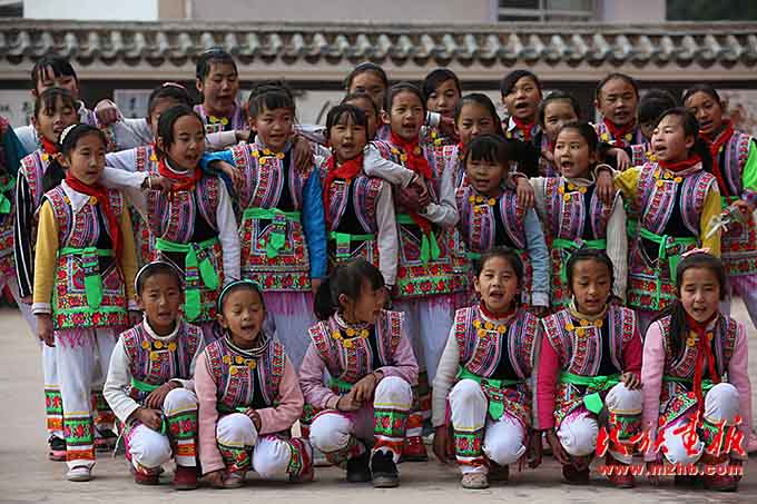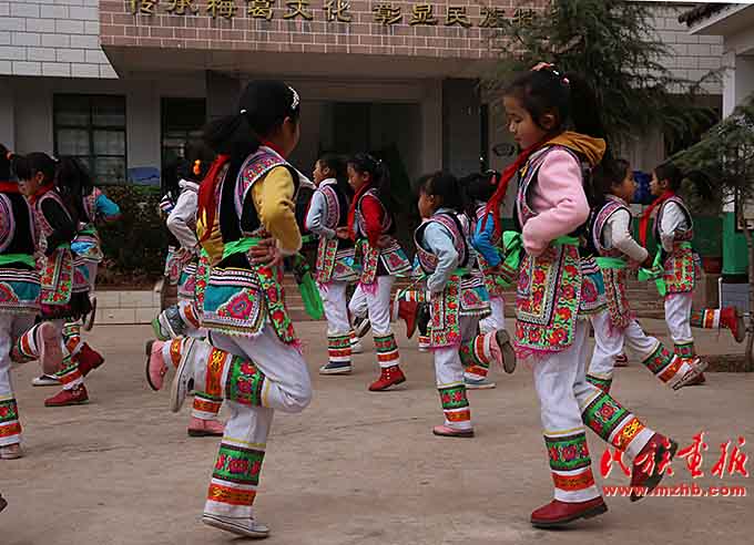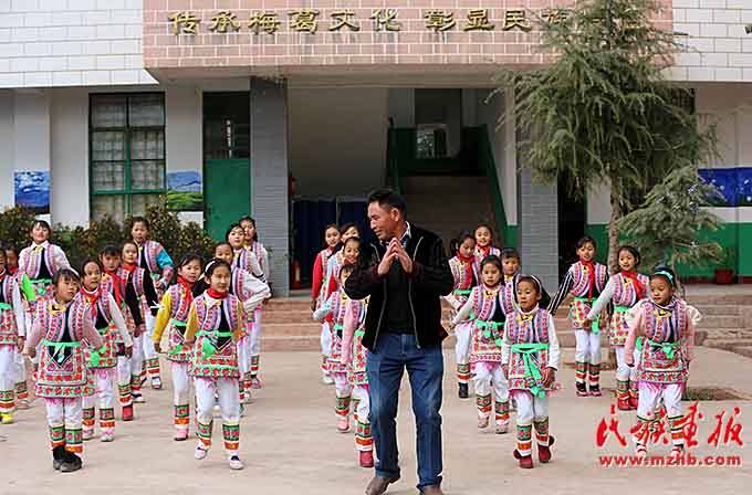 明德小学的校长马骏是汉族人,却深深热爱着彝族“梅葛”文化。“我们这支‘娃娃梅葛’传唱班有30人,最大的11岁,最小的刚满7岁,每周请传承人授课两次,看到彝族孩子们通过我们办的特色教育将‘梅葛’文化传承下去,我感到很光荣。”马骏校长激动地说。