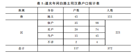 首先,在聚落形态方面,至道光年间,白路土司地区的汉彝人口比例变化巨大。在表1记载的117户当中,汉人72户211人,彝人45户151人,汉人在数量上已经超过了彝人。日益增多的汉人聚落逐渐对白鹿营等土司聚落形成四面包围之势,这使得白鹿营及其附近地区先前“夷多汉少”的聚落形态发生了逆转性的改变。