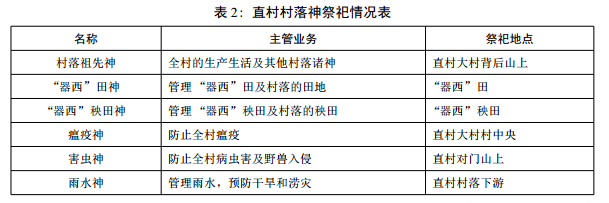 祭祀仪式还是人们生产生活的反映。这里以直村村落神祭祀为例,来说明祭祀仪式所反映的生产生活内容。直村村落神主要有村落祖先神、“器西”田神、“器西”秧田神、瘟疫神、害虫神、雨水神。祭祀村落神的主要目的是保佑丰产。相关情况见表2。