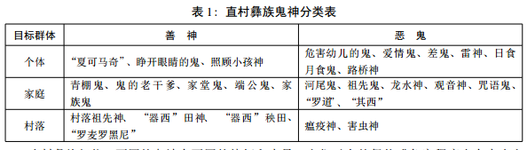 直村彝族祭祀仪式的基础是信仰“万物有灵”,认为山有山神,树有树神。直村彝族将灵魂、鬼、神和精灵等一切与人或物相对的另外一个世界的,看不见、摸不着的活动体统称为“尼”。根据直村彝族对“尼”内涵和外延的阐释,本文将之意译为鬼神,善者为神,恶者为鬼。直村“尼”的种类和数量众多,也有不同的分类。笔者根据两个标准,一是鬼神针对的目标群体,即个体、家庭和村落;二是庇佑的善神和危害的恶鬼,将直村彝族的鬼神进行分类。表1是直村彝族鬼神分类表。